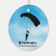 Paraquedismo do Céu Ornamento Personalizado Natal 20XX. Os Skymergs formam um círculo de queda livre contra um céu azul com nuvens de fundo. Todo texto personalizável, frente e verso!
