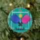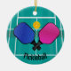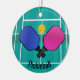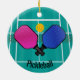 Ornamento de Design de Pickleball com texto personalizável em ambos os lados. O Pickleball é um esporte de raquete/remo que foi criado através da combinação de elementos de vários outros esportes de raquete. Dois ou quatro jogadores usam pás sólidas para acertar uma bola perfurada de polímero sobre uma rede.
