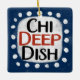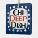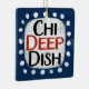 Um design de mensagem tipográfica divertido e fofo que diz "Chi Deep Dish". Ele tem texto preto e vermelho em um retângulo branco com pontos brancos engraçados e brincalhões ao seu redor, tudo em um fundo azul.
