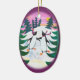 Um Ornament Oval divertido, com dois Pinguins bonitos se divertindo, patinando no gelo, em uma paisagem nevada com árvores de abeto e um sol de cenário; de uma colagem de papel pintada manualmente por Judy Adamson.