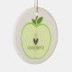 Um ornamento do professor de jardim de infância que caracteriza uma ilustração da metade de uma maçã verde com as duas sementes na forma de um coração. O texto diz-me "jardim de infância (do amor).