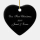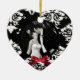 Um ornamento decorativo personalizado em forma de coração, com uma foto de casamento cercada por gráficos de um corte circular em preto e branco, terminado com sotaque vermelho de arco. Personalize com a sua fotografia de casamento e o texto no fundo, por uma lembrança memorável.
