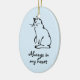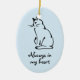 Adicione o nome do seu gato ao reverso desta imagem de Gatinho Cria uma manutenção de um amigo felino muito amado. Este ornamento memorial do gato mostra um desenho de tinta de um gato sentado e tem o slogan "Sempre no meu coração" (que pode ser mudado para plural se necessário). Você pode adicionar seu próprio nome de gatinho ao contrário. O ornamento é uma sombra azul macia.