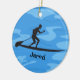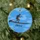 Paddleboard Personalizado Ornament Natal 20XX. Um cartucho se coloca sobre um conselho contra um fundo de água azul. Todo texto personalizável, frente e verso!