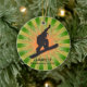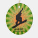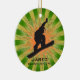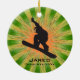 Snowboard Personalizado Ornament Natal 20XX. Um snowboarder coloca-se sobre um conselho contra um fundo verde e laranja de explosão de estrelas. Todo texto personalizável, frente e verso!