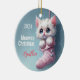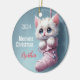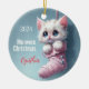 Um gatinho bonito com olhos grandes numa meia rosa. Personalizado com o ano e o nome do Natal.