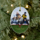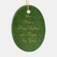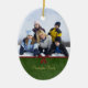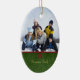 Este ornamento cerâmico dado forma oval tem um design verde clássico do redemoinho com uma fita vermelha e o arco na parte dianteira. Você pode facilmente adicionar sua fotografia da família na parte superior. Na parte inferior, você pode personalizar este com seu nome de família. Na parte traseira, você pode personalizar este com um cumprimento e o ano.
