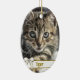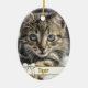 Ornamento com fotos de animais de estimação em ambos os lados. Pequenos arcos ao lado de nomes em ambos os lados de ornamentos em forma oval. Adicione imagens verticais (retratos) orientadas a animais, crianças ou qualquer pessoa que você escolher. A fita e a design do arco na frente são brancas com ouro, e o nome é dourado. No verso, o arco e a design de fita são azuis-escuros com texto branco para o nome.