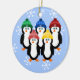 Este ornamento adorável da árvore de Natal é perfeito para a pessoa que ama pinguins, recolhe artigos do pinguim, ou apenas ama simplesmente coisas bonitos! Características de design uma luz - fundo azul com flocos de neve brancos. Há cinco pinguins preto e branco pequenos bonitos que estão em um grupo. Cada pinguim pequeno está vestindo um chapéu do inverno com design do floco de neve nele. Os chapéus estão em verde, em azul, em vermelho, em cor-de-rosa e em amarelo. Estes pinguins pequenos todos são vestidos e aprontam-se para o inverno e a chegada do Natal! Este ornamento da árvore de Natal pode ser personalizado adicionando um nome ou uma licença como é! A escolha é sua! Este os pinguins no ornamento da árvore de Natal dos chapéus do inverno farão a uma grande adição a sua árvore de Natal este ano e a sua coleção do pinguim!