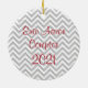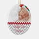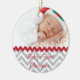 O primeiro ornamento fotográfico de Natal feito em cinzas e padrão de fevron branco. A metade superior da frente está pronta para a fotografia do seu bebê e o texto do roteiro vermelho, na frente e atrás, está pronto para personalizar. É uma maneira maravilhosa de comemorar o primeiro Natal do seu filho, e a ideia de presente de excelente para os grandes pais.
