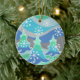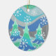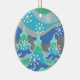 Uma paisagem de inverno moderna e estilizada com pinheiros foscos e flocos de neve espumantes. Um ornamento cerâmico com uma cinza verde, azul, prata e branco personalizável para você personalizar com seu próprio texto, imagens e ideias. Imagem criada usando um desenho a lápis colorido melhorado digitalmente.
