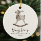 Toy Reindeer Baby's First Christmas Cerâmica Ornament — O precioso personalizado do ornamento de Natal do modelo apresenta um adorável cavalo de balanço de uma rena de brinquedo de aquarela. As caixas de texto permitem uma fácil personalização do nome de qualquer bebê em um tipo de letra de escrita caligráfica manuscrita, e o ano de nascimento em um serif simples e minimalista. Ambos os lados desta decoração personalizável, neutra em relação ao gênero da árvore de manutenção são idênticos.