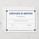 Certificado de adoção de animais de companhia em branco com uma moldura de impressão de pata. Certificado de adoção azul e branco impresso com estampas bonitas. Certificado branco e azul de adoção de animais de companhia com fontes e patas bonitas.