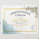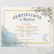Esta design apresenta folhas de aquarela, água e pomba. Esta é uma bela design moderna para um certificado de batismo.