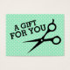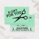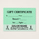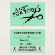 Um certificado retro, moderno e divertido de presente de cartão de visita, com a menção "certificado de presente" num grande e alto impressão com tesoura/tesoura num fundo pokadot verde da casa da moeda. Perfeito para cabeleireiros, cabeleireiros, cabeleireiros, cosmetólogos, cosmetologia, salões, spas e muito mais!