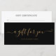 Certificado de presente preto e ouro minimalista simples e elegante. Este elegante certificado de presente de script ajustado perfeitamente dentro de um envelope comercial nº 10 padrão. Perfeito para a sua marca e negócios.