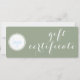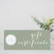 Um design elegante e sofisticado em verde-pálido para uso como um certificado de presente comercial. Esta peça tem um belo estilo caligráfico escrevendo na primeira leitura Certificado de Presente e um pequeno espaço reservado para logotipo. O inverso na cor verde do eucalipto com texto personalizado em branco para os detalhes do vale-presente, juntamente com os detalhes de contato comercial e a página da Web.
