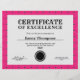 Um elegante certificado de prêmio comercial moderno em um design de padrão magenta rosa-quente. A cor magenta rosa pode provocar uma grande variedade de emoções e pensamentos, o que promove compaixão, apoio e gentileza e estimula um sentimento de autorespeito e contentamento em quem a usa. Pode ajudar as ambições e os desejos a tornarem-se realidade. Nas aplicações comerciais, a magenta-rosa é mais adequada para as aplicações artísticas ou criativas, como artistas, figurinos ou designers, escritores, fotógrafos, inventores, compradas de fornecimento de artistas ou de arte. A magenta é uma cor benéfica para mentores e treinadores de vida a serem usados para ajudar seus clientes a largar ideias antigas e a seguir em frente em suas vidas. As suas mensagens imaginativas e inovadoras são encorajadoras para todos aqueles que olham para o futuro. Se quiserem ter um impacto que diga ultrajante e vivo de uma forma positiva, a magenta fá-lo-á por vocês! Se você tiver um recurso exclusivo para a sua empresa, a magenta desenhar atenção a ele. Personalize facilmente o seu texto personalizado e outros detalhes.