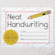 Um certificado de prêmio em sala de aula para recompensar os alunos pela sua caligrafia. O plano de fundo é a ilustração do papel do notebook. A design inclui também ilustrações de um lápis amarelo e de um selo dourado.