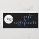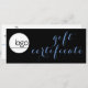 Modelo de certificado de presente de tendência para negócios em azul, preto e branco. Esta peça tem um elegante roteiro de caligrafia azul que diz "Certificado de Presente" e um logotipo na frente, contra uma cor preta. O inverso é branco com texto preto personalizado, dividido por uma linha azul fina e dinâmica. Uma design para uso como vale-presente para varejo, hospitalidade e outros negócios voltados para o cliente.