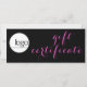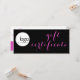 Tendy rosa e modelo de certificado de presente comercial preto. Esta peça chic tem uma letra de estilo de escrita de caligrafia na frente, em rosa quente a preto, que diz "Certificado de Presente". Há também espaço para o logotipo da empresa. Ao contrário, há texto personalizado editável em cor rosa em uma cor branca no topo e preto em rosa na base... fundo de cor. O texto inclui os pormenores do certificado de oferta - a partir da data/validade do prazo de validade e o valor/montante, bem como os pormenores da empresa que emite o vale-presente - nome da empresa, endereço de rua, número de telefone e sítio web.