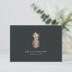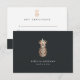 O Elegante presente certificate design exibe seu nome e/ou nome comercial sob uma ilustração falsa de abacaxi de folha de cobre em um fundo preto suave. Adicione o texto desejado do certificado-presente e as informações de contato comercial no verso com uma ilustração menor do abacaxi. Uma escolha elegante para salões, maquiadores, cabeleireiros, spas, boutiques e muito mais.