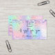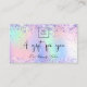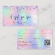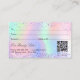 Um fundo holográfico de tendência com cores unicórnicas e cores arco-íris em cor rosa, roxo, verde-menta. Decorado com confete. Personalize e adicione o logotipo da sua empresa, nome na parte frontal: Modelos para seu nome, endereço, detalhes de contato e seu próprio código QR ao seu site ou conta de mídia social. Perfeito para mulheres empresárias, consultores, salões de beleza, donas de negócios.