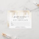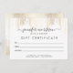Seu nome ou nome comercial é exibido elegantemente em uma fonte de script para uma impressionante impressão neste cartão de certificado de presente do designer. Um fundo delicado de pontos de confete caídos em ouro falso dá a ilusão de nadador. Excelente para maquiadores, cabeleireiros, salões de beleza, boutiques e muito mais. Entre em contato com o designer se precisar de ajuda com nomes mais longos ou composição especial de texto. Arte e design © 1201AM Design Studio | www.1201am.com