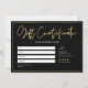 Glam e certificado de presente luxuoso em preto e ouro com espaço para seu logotipo, ícones de mídia social e detalhes da empresa. Perfeito para usar como um vale de presente de spa ou salão de beleza personalizado para seu bar de lash, sobrancelha ou unha. Os falsos efeitos dourados e a fonte moderna do script adicionam uma chic e elegância a este modelo de comprovante profissional de negócios.