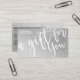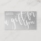 Este é o perfeito cartão de visita de certificado de presente para uma moda, na moda, menina, e empresária moderna. Este design apresenta uma típica tipografia de pincel branco manuscrito em uma falso cintilação prateada cintilante e gradiente de sombra de cinza clara glamourosa e fundo chic. É a maneira perfeita de permitir que seus clientes comprar um presente para sua família e amigos e, ao mesmo tempo, promova sua empresa. ***NOTA DE DESIGN IMPORTANTE: Para qualquer solicitação de design personalizada, como solicitações de correspondência de produtos, alterações de cor, mudanças de posicionamento ou qualquer outra solicitação de alteração, clique no botão "CONTACT" ou envie um e-mail ao designer diretamente em lafemme.art@gmail.com. Você pode até enviar um e-mail para ela solicitando um design completamente personalizado e novo.