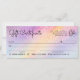 Esta simples e glamourosa certidão de presentes no estilo de cheque de negócios é perfeita para qualquer empresária moderna; salões de beleza, maquiadores, cabeleireiros, esteticistas, esteticistas, escritores, agentes imobiliários e muito mais profissões. Ele apresenta um gradiente de ombreira unicórnio impresso cintilamente (roxo, rosa, amarelo e azul) com tipografia cursiva escrita manuscrita preta. É elegante, giro, giro, bonito, chique, moda e legal. ***NOTA DE DESIGN IMPORTANTE: Para qualquer solicitação de design personalizada, como solicitações de correspondência de produtos, alterações de cor, mudanças de posicionamento ou qualquer outra solicitação de alteração, clique no botão "mensagem" ou envie um e-mail ao designer diretamente em lafemme.art@gmail.com. Você pode até enviar um e-mail para ela solicitando um design completamente personalizado e novo.