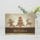 Ilustração elegante e deliciosa de Natal: Árvore de Natal de pão de gengibre decorado, homem de gengibre e veado de gengibre com estrelas de ouro sobre fundo de chavão castanho.