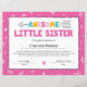 Não importa o tamanho do marco, comemore como se fosse o maior de sempre. Nosso Certificado Irmã Cor-de-Rosa, Certificado Irmã Irmã, Certificado Irmã Irmã, foi criado com esses sentimentos. Nosso Certificado Irmã Rosa Certificado Irmã Pequeno Certificado Irmã Certificado Irmã é personalizável para que você possa fazer isso seu. O Certificado Irmã Cor-de-Rosa Certificado Irmã Pequeno Certificado Irmã é fantástico para crianças de todas as idades. Entregue o nosso Certificado Irmã Cor-de-Rosa Certificado Irmã Pequeno Certificado Irmã Certificado Irmã e deixe começar a celebração! #certificado da irmã #Certificado da irmã menor #certificado da irmã #certificado da irmã "modelo do prêmio" imprimível #certificado da conquista pdf #Prêmio #certificado do marco #comemorações do marco #anúncio do parto © Doodles Ave