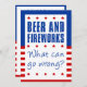 Cerveja e Fireworks - O que pode dar errado convite engraçado para uma festa de 4 de julho. Um convite hilário para uma festa do Dia da Independência com álcool e fogos de artifício! Cor vermelha branca e azul.