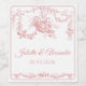 Adicione um toque de elegância romântica francesa ao seu casamento com este rótulo de garrafa personalizado Toile de Jouy em rosa beije suave. Com uma moldura vintage ornamentada e uma delicada ilustração de cupido e flores inspirada em gravuras francesas do século XVIII, este design traz charme atemporal e sofisticação refinada para a decoração da sua mesa.