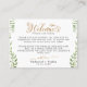 Este cartão de lugar para saco ou cesta de presente de boas-vindas para casamento em aquarela verde dourada é ideal para uma celebração inspirada em boho. Com folhas de eucalipto e aquarela verde escura e rica, o design combina elegância rústica com um visual moderno de floresta.