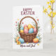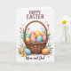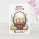 Este cartão de Páscoa mostra uma cesta marrom trançada com textura fina e sombreamento suave, repleta de ovos ovais decorativos em tons pastéis suaves de azul, rosa, amarelo e laranja, cada um pontilhado com pequenos pontos brancos. Ao redor da cesta, raminhos de verde e pequenas flores em rosa e amarelo solar inclinam-se para dentro como se tivessem sido reunidos com cuidado, adicionando um toque aconchegante e afetuoso 🌷. Alguns ovos estão posicionados logo fora da cesta, espaçados como se tivessem sido colocados por alguém que compartilha o momento com um ente querido 🐰. A iluminação permanece suave e uniforme, dando à cena uma aparência calma e acolhedora sem sombras duras. Perto do topo, as palavras “FELIZ PÁSCOA” aparecem em letras maiúsculas em uma cor marrom profundo, centralizadas acima da ilustração. Ao longo da parte inferior, “Mamãe e Papai” está escrito em um estilo cursivo