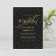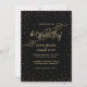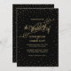 Estrelas de ouro pequenas e brilhantes brilham em nuvens de confete ao redor da borda deste belo convite de casamento a ouro e preto, com uma escrita de efeito reluzente dourado, "o Casamento de". Rico, chic e encantador de uma só vez. Perfeito para um casamento noturno debaixo das estrelas. Arte original de Colleen Michele. Por favor, note-se que não existe um verdadeiro efeito de brilho de ouro ou de folha de ouro nas estrelas e no guião; não será utilizada qualquer brilho, folha de ouro ou tinta metálica neste convite.