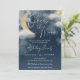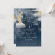 Convite de chá de bebê além da lua dourado e azul naval com estrelas douradas e nuvens