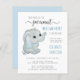 Um convite de chá para um bebê amigo do orçamento. "Nosso doce amendoim está a caminho" é escrito em uma mistura de tipografia de cinzas azuis e suaves e uma bonito escrita com pestanas. Personalize os nomes do bebê e da futura mãe na tipografia azul ao lado de uma aquarela fofa de um elefante bebê e adicione os detalhes do chá na simples tipografia moderna de cinzas.