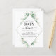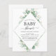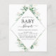 Convites de Chá de Bebê Primavera com Eucalipto Verde Botânico Aquarela e Folha Dourada Falsa Geométrica em fundo branco - inclui tipografia de script bonita e elegante com folhas botânicas modernas e folhagem para a celebração especial da futura Mãe.
