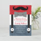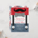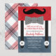 Este belo convite para chás de fraldas é perfeito para aquele doce bebê! Apresenta um bigode, gravata de arco e suspensórios em um esquema de cores vermelho, branco e azul marinho com xadrez no verso.