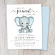 Um convite de chá de bebê de menino por correio fofo e econômico com "Um Pequeno Amendoim Está a Caminho" escrito em uma mistura de tipografia moderna cinza suave e uma escrita estilosa, e uma aquarela azul pastel de um elefante bebê. Você pode personalizar o nome da mãe e os detalhes do chá por correio em tipografia cinza simples.