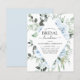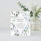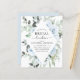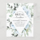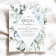 Convites de Chá de Noiva de Casamento de Primavera ou Verão com Orçamento Azul Empoeirado com Rosas Florais e Eucalipto Botânico com Tipografia de Letra Elegante e Moderna com Flores Botânicas Tropicais para a Celebração Especial do Dia do Casamento.