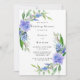 Design apresenta uma cor impressa com elemento floral em tons de azul roxo e poeirento sobre o verde folhas ramos coroa e flores de tulipas de peônias hyacintas em um fundo de cor azul-claro-lilás azul-água. Excelente para as comemorações do casamento!