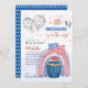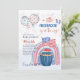 Esta bonito aquarela de 4 de julho (cupcake de fogos de artifício EUA sinaliza arco-íris em branco vermelho e azul sobre um fundo azul) tema Baby Boy ou Girl Chá tem campos de modelo de texto em ambos os lados para que você possa adicionar todos os detalhes do evento. Este convite também pode ser usado como convite de festas ou anúncio revelador de gênero.