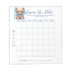Melhore seu chá de fraldas com uma suposição personalizada e personalizada sobre a atividade do jogo de data. Os convidados tentam selecionar a data de nascimento correta. Este é um estilo de calendário sem os números reais mostrados. Os convidados podem escrever na data eles próprios, ou você pode optar por incluir os números dependendo do mês desejado. Quem escolhe corretamente ganha um prêmio. Vem em um estilo de bloco de notas de 40 páginas rasas do lado do solteiro. Há até espaço para os participantes fornecerem seus nomes para se referirem mais tarde. Teddy Bear Blue Design. Ajuste ou altere o texto conforme necessário. Use a modelo para criar seu próprio chá de fraldas adivinhar o jogo de data.
