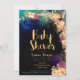 Convite para chá de fraldas boho-chic. Para a mãe da boêmia alternativo a ser. Gira de energia feliz com essa cor d'água colorida floral e penas em azul escuro a preto design de fundo. Mandala com penas e cartões de chá de fraldas para flores, adequados também para chá de casais em todas as ocasiões | Feita com amor Configurada por Webgrrl.art