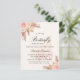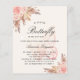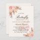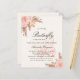 Para um chá de fraldas moderno estilo boho. Um fundo bege. Decorado com flores, rosas, grama-pampas e borboleta cor-de-rosa. Personalize e adicione um nome e detalhes da parte. 1 folha = 1 convite impresso de borda a borda.