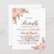 Para um chá de fraldas moderno estilo boho. Um fundo branco. Decorado com flores, rosas, grama-pampas e borboleta cor-de-rosa. Personalize e adicione um nome e detalhes da parte. 1 folha = 1 convite impresso de borda a borda.